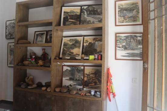(图为杨必熙所作的山水画和所展示的奇石 通讯员刘洁供图)
