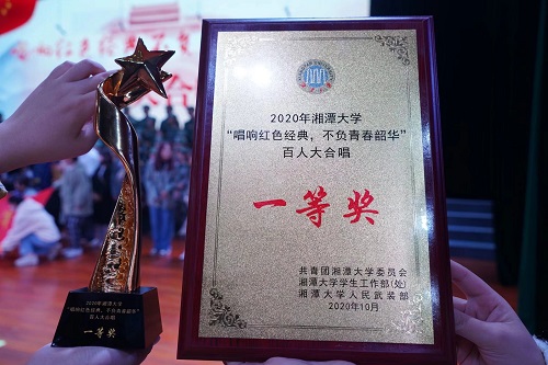 红日初升,其道大光;河出伏流,一泻汪洋。比赛现场,歌声悠扬,各学院以朗诵、舞蹈结合合唱的形式,为我们带来了《不忘初心》、《我爱你中国》、《映山红》、《江山》等精彩曲目,展现了湘大学子良好的精神面貌和蓬勃的青春力量。比赛如火如荼地进行着,现场气氛高涨,唱响了脍炙人口的经典曲目,亦凝聚着一颗颗赤诚的爱国之心。