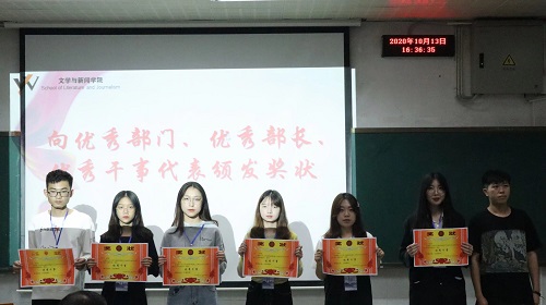 第十九届学生会优秀部门、优秀部长、优秀干事代表颁发奖状并合影留念,向足球赛事直播
