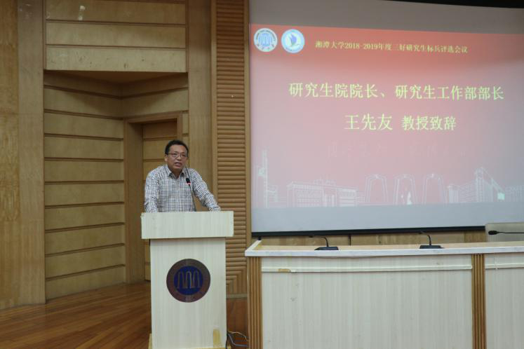 会议伊始,研究生院院长、研究生工作部部长王先友致辞。他指出,大学不在于大,而在于学,学生为本,学者为先,学术为基,学风为要,学是大学之根本,这也是我们要进行“三好研究生标兵”评选的原因。“三好研究生标兵”作为校研究生的楷模,此荣誉不仅代表着湘潭大学全体研究生的奋斗目标,更是代表着研究生的精神面貌及努力方向。