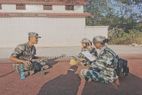 女生较多的特点,并没有采取太过严格的训练方式。而是一直在努力地寻找训练规整和气氛欢愉的平衡点,在活跃气氛之余抓好训练。这是他第二次在军训中担任教官的角色,在被问及连长和排长的工作有什么不同时,他说连长需要处理很多日常训练之外的事务,承担的责任更重,也更能带给他挑战和新的体验。他坦言道,模拟营生活留给他最深刻的记忆的便是和朋友朝夕的相处,也正是因为模拟营的生活,让他萌生了在大学毕业后参军的想法。