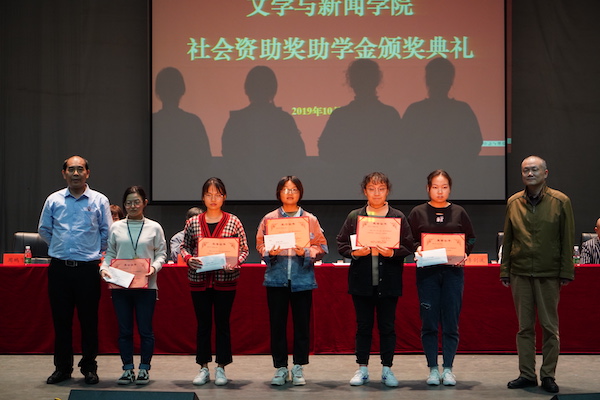 院党委副书记周鹏飞宣读湘潭大学“深圳市瑜水慈善基金会凡恩奖学金”、广告专业校友会助学金、“晨曦”奖学金及2000级新闻二班思源奖学金、助学金表彰决定。李剑波院长、季多武副院长、覃岚老师以及相关奖项负责人代表付早根、易建国、杨乐、李强先生分别为获奖学生颁奖并合影留念。