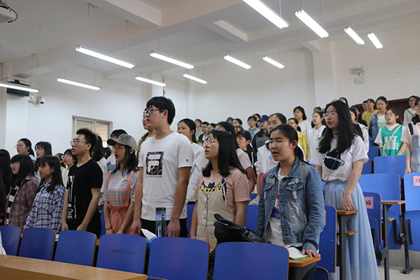 课程最后,组织部的毛俊桐同学上台带领大家重温入团誓词。激昂的声音响彻了整个教室,展现出了国之栋梁的动人风采。