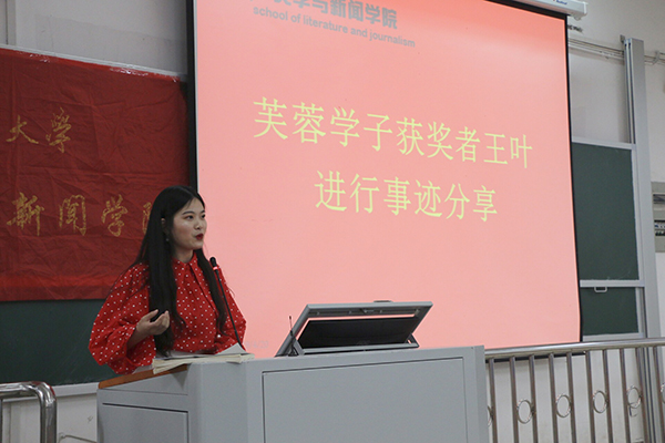 主持人石浪进行开场致辞,宣布本次报告会正式开始。随后由芙蓉学子获奖者王叶进行事迹分享,王叶学姐从个人经历出发,与校园现状相结合,以鲜明的事例与幽默的语言向大家生动地讲述了自己大学四年的心路历程。从大一刚踏入校门时的心高气傲到后面竞选班长遭受打击的茫然无措,害怕挂科而打算复读,再到最后逆流而上的顽强拼搏,王叶学姐用自身的经历诠释了自强不息。紧接着王叶学姐讲起了自己实习时的趣事以及实习教会她的道理,通过自己的经历告诉大家实习的重要,并呼吁大家早日开始实习,这不仅能为今后步入社会打下牢固的基础,也能积累下一份宝贵的人生经验,更能在简历上增添一分光彩。最后,王叶学姐分享了她保研的经历,为正处于迷茫时期的同学们点亮了一盏引路灯。演讲之后,台下热烈的掌声经久不息。