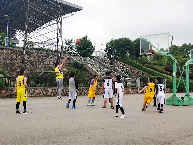 比赛后半场,学生队失误不断,虽然教师队明显体力不支,但是他们还在坚持,他们根据学生队的实力及时调整战术,乘势奋起直追,老练沉稳的运球,精准稳当的传球、断球,以及潇洒的投篮,一度将比分反超。