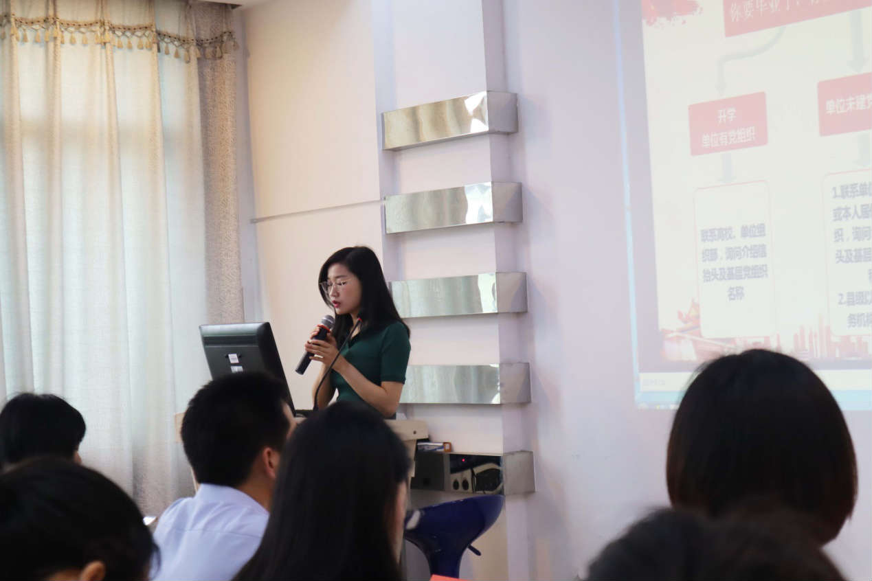随后,李蜜老师针对如何转接党员档案及党组织关系作了详细的介绍。她以风趣幽默的语言介绍大家从群众到党员这段时间与共产党的关系,使大家清楚明白的了解他们与党的关系。李蜜老师还带大家理清了毕业生要准备的各种手续,所要填写的表格以及档案所需材料和寄送时间。李蜜老师的拳拳之心殷殷之情现于言外,同学们在仔细聆听之外也为李蜜老师的细心而感动,也被老师诙谐风趣的语言触动,送上一阵热烈掌声。