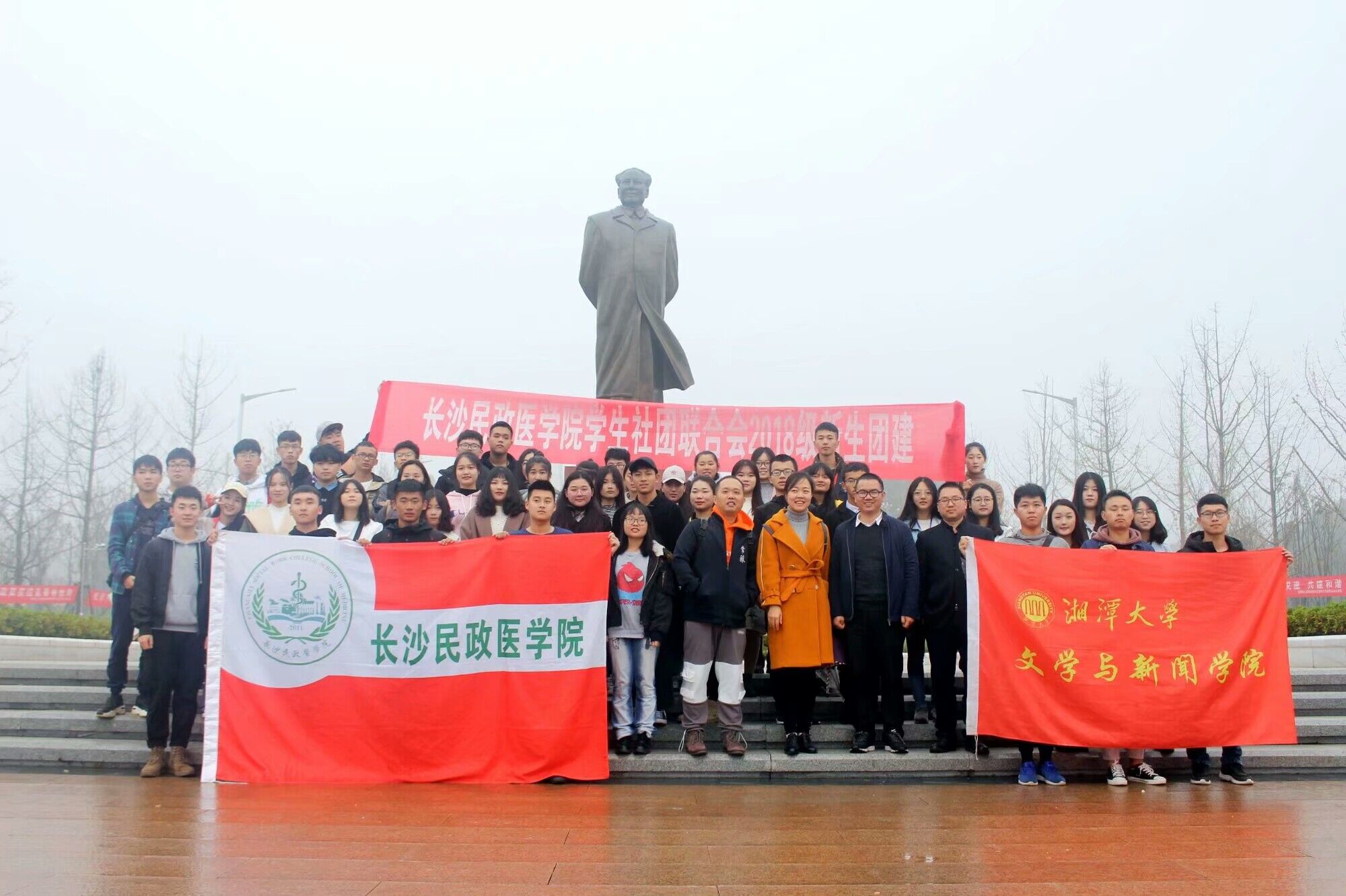 上午九点,在民政医学院的四十余位同学抵达湘大后,由我校团委学生会办公室主任丛铭同学带领大家从南门广场出发并为大家讲解湘大历史、讲述湘大故事,在讲解到毛主席铜像的内涵和三拱门的寓意时,同学们不时发出赞叹声,大家在我校标志性建筑毛主席铜像前合影留念。