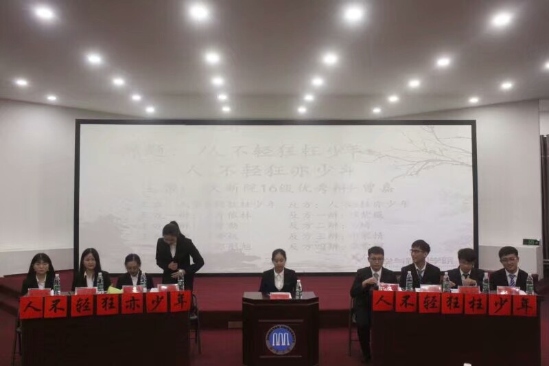 比赛伊始,由正方一辩肖依林发言,开篇立论,首先给出了轻狂和少年的定义,他们认为少年意味着旺盛的精力、丰富的创造力,是除了钱之外,人生的巅峰状态。而轻狂是把终点抛在脑后的浪漫,也是情绪化的、不成熟的判断。随后提出了己方的观点:唯有少年时代,我们才拥有着无限;轻狂是少年时代最本实的底色,幻想注定是贯穿少年时代的一条主线。其语言幽默诙谐,逗得同学们哈哈大笑,又充满道理,赢得在场观众的阵阵掌声。紧接着,反方四辩廖雪丽提出首质,他以正方一辩提出了的猪肉炖粉条为例,巧妙地提出反对观点。正方一辩肖依林始终冷静沉着地回答问题,清晰的吐词加上幽默的语气让现场气氛更加热烈。