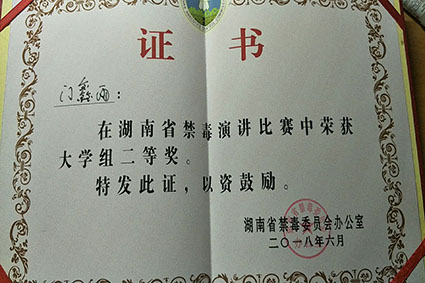 6月1日在长沙举行的“健康人生,绿色无毒”湖南省禁毒演讲比赛上,我院17级新闻传播学类专业1班学生门鑫雨的演讲《生命的花田中禁种罂粟花》得分9.60分,荣获得大学组第二名的优异成绩,为我校增光添彩。