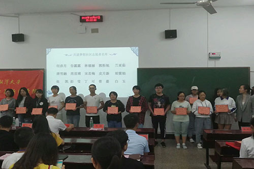 大会第二项由管胜昔老师致开场词。伴随着热烈的掌声,管老师走上台表达了对志愿者这一身份的赞赏和支持,她说:“志愿者是富有的,也是幸福的。因为能付出是一种富有,被需要是一种幸福。”接着,管老师指出了这一年来志愿者服务需要改进的地方:志愿服务活动策划要立足全局,注意统筹规划和整合有限资源;着眼需求,兼顾服务者和被服务者的需求;注重创新,在科学继承的基础上为志愿服务活动注入新的血液和活力。“我们每做一件事情都要以精益求精的态度,初心不变,一往无前。”管老师用这句话与大家共勉,表达了对志愿者在以后的活动中有所收获、有所成长的期望。