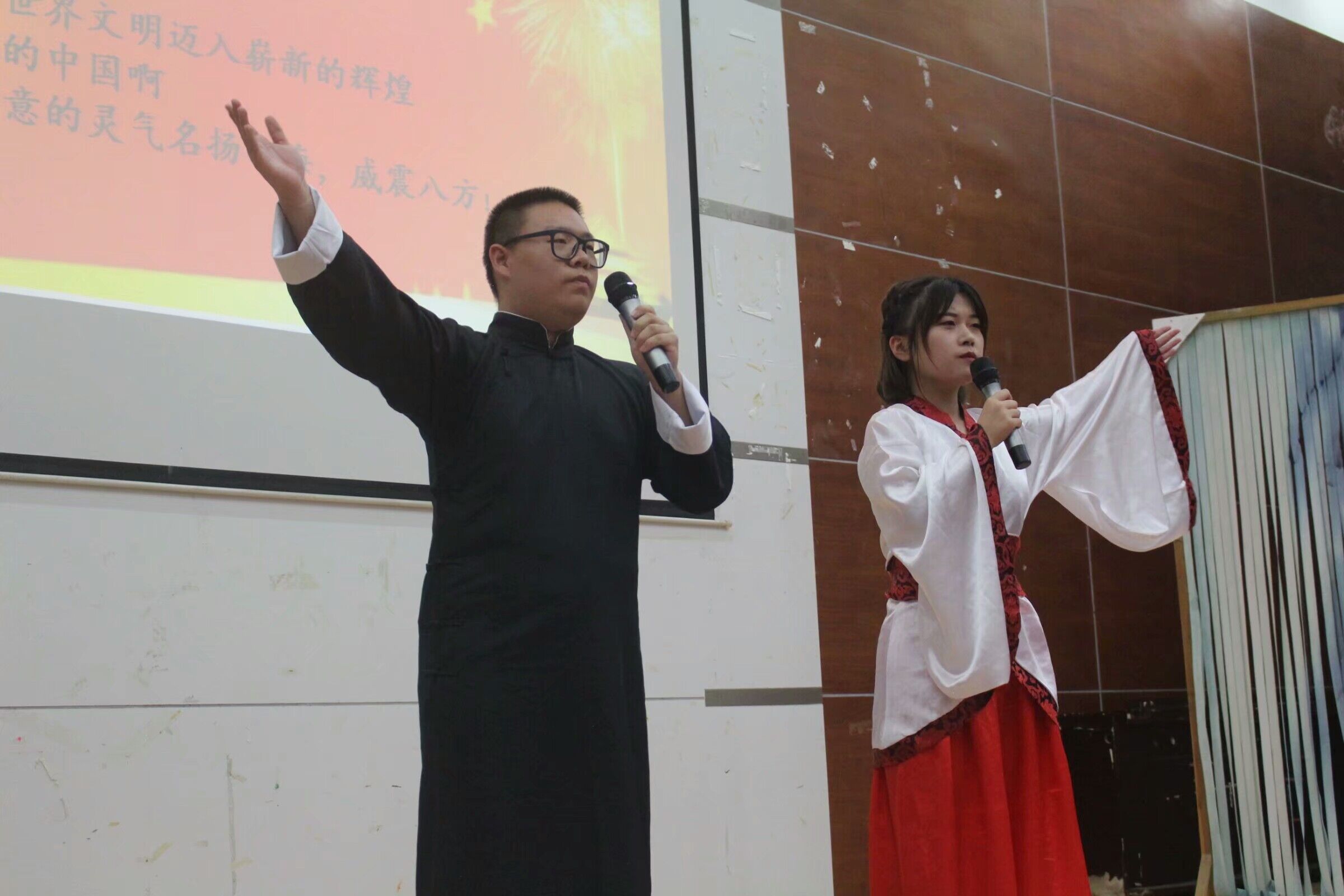 比赛正式开始,首先出场的是一号小组,来自17中文二班的郭彤旭和17中文三班的向筱旦同学,一首《可爱的祖国》展现了他们深刻的爱国之情;二号选手是来自18广告一班的李一航同学,他用激情的话语朗诵了一首《我是中国人》,让在场的各位热血沸腾;三号选手郭昕妍也来自18广告一班,身穿旗袍的她深情地朗诵了一首《我的祖国》,一腔热血溢于言表;四号选手17新闻一班的赵东宇同学一首《请与我同行》展现了舒婷的浪漫与自己的情怀;“这个夜晚,我为月光下的中国写一首诗。”五号选手是17中文一班的向维维同学,柔情似水的朗诵展现文科女孩特有的气质;六号选手是来自18新传一班的赵子杰同学,吐字铿锵、感情真挚,一首《我的南方与北方》令全场激情澎湃。