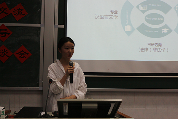 第二个环节则是由14级学姐进行经验分享。首先上台进行经验分享的是保研到中国人民大学比较文学与世界文学专业的刘彦辰学姐,她从实力要与学校匹配、专业要跟兴趣走等方面给大家提出建议,告诉同学们要多逛考研贴吧,看各种各类书以备面试等小技巧,并且介绍了自己面试与笔试的一些小经验,告诉大家“即使别人都否定你,你也不要否定自己”。第二位是保研到暨南大学新闻与传播专业的曹文昱学姐,她在发言中为我们介绍了学校对于保研的具体要求以及关于论文发表的具体事项,并为大家讲解了一些基本的概念。最后,曹文昱学姐为大家推荐了《传播学教程》和《新闻学概论》两本考研教材。第三位是考研到中南大学法律(非法学)专业夏宁学姐,她为大家介绍了法硕的具体概念,并且为大家普及了该专业的特殊性以及报考的要求。第四位是考研到中国传媒大学新闻与传播(国际新闻方向)的张聪学姐,她为大家介绍了自己的学习方法,提醒考研学生要有计划有安排的复习,并注重时事热点用理论和热点结合多方获取信息。最后一位则是考研到湘潭大学中国语言文学的王菊玲学姐,她主要讲了考本校的优势以及学习方法,并针对自己的考研经验为同学们建言献策。在提问环节,针对同学们的各项问题,她们还分享了答题技巧等等。