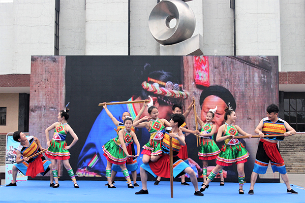 怀化文化旅游高校行及招才引智专场活动融视频宣传、独具风情的民族歌舞表演、学生特色节目、现场旅游知识问答互动于一体,为现场观众带来了一场视听盛宴。来自怀化的少数民族表演者们穿着精美的民族服饰,带来了活泼灵动的舞蹈《千担尖尖咵打咵》,引得场下观众掌声连连。侗族代表们唱起了侗族大歌,男声的低沉浑厚和女声的高亢有力结合在一起,充满着原生态的魅力。歌舞节目《雪峰山》和《黔城往事》,或浑厚有力,或柔美婉转,用歌舞传达出怀化的魅力。足球赛事直播