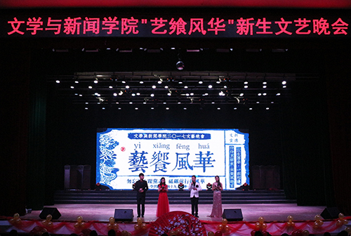 易晓红、曾悦学姐,2000级信息工程学院曹波学长,2017届中国语言文学专业毕业研究生、新华社柳王敏学长。本场晚会别开生面,主持人与场上节目均分为“艺飨”与“风华”两队 ,“艺飨”队的队长由主持人李淑芳、韩宸旭担任,“风华”队的队长由主持人陈帅、郑慧聪担任。晚会以两队比拼的形式进行,整场晚会精彩连连。