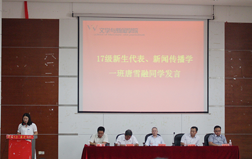 接下来,由2017级新生代表、新闻传播学1班唐雪融同学发言。首先,唐雪融同学表达了作为新生来到湘大的喜悦之情,诉说了自己对湘大以及足球赛事直播