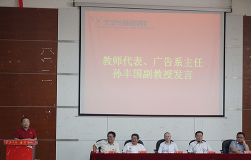 广告系主任孙丰国副教授上台发言。孙教授以广告的角度,选取了三个具有代表性的广告语作为对同学们的鼓励:“你本来就很美”、“让改变发生”和“一切皆有可能”。孙教授以切身经历为例,激励新生们不断奋进,告诫大家要谨记来到大学的目的,珍惜这十几年来之不易的学习成果并继续保持下去,不忘拼搏的精神与动力。“最后,我期待我们每一位同学都能够珍惜时光、好好努力,经过四年,每一位男同学都变得‘有才有味有型’,每一位女同学都变成‘淑女才女美女’。”孙教授富有幽默感的话语不仅使同学们收获了极大的乐趣,还增长了许多见识,台下掌声十分热烈。
