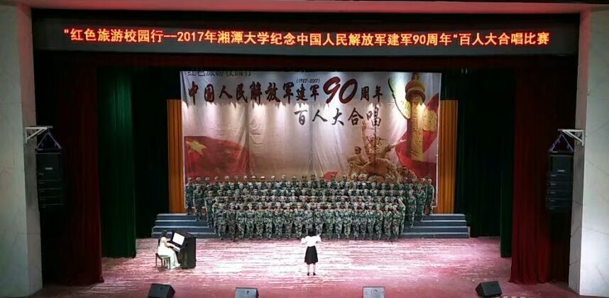 10月6日晚,“红色旅游校园行——2017年湘潭大学纪念中国人民解放军建军90周年”百人大合唱在俱乐部隆重举行。出席此次活动的领导及老师有:湘潭大学副校长刘建平教授,学生工作部处谢罗奇处长,湘潭大学校团委魏晓林书记,环境与资源学院葛飞院长,以及各院系党委副书记及团委书记。除此之外,湘潭市文联主席团委员、秘书长,市青年音乐家协会主席,谭真老师;全国社会音乐考级声乐考官,湘潭市青年音乐家协会副主席,谭娟老师;湖南省音乐家协会合唱委员会理事,湘潭市青年音乐家协会副主席,陈艳老师;湘潭市青少年宫艺术学校副校长,湘潭市青年音乐家协会副主席兼秘书长,黄军老师;湘潭大学团委办公室主任,湘潭市青年音乐家协会副主席郭滟老师也作为嘉宾莅临现场,并担任本次比赛评委。本次比赛以学院为单位,各学院均在赛前进行了积极的准备,在比赛中唱出了属于自己学院的风采。