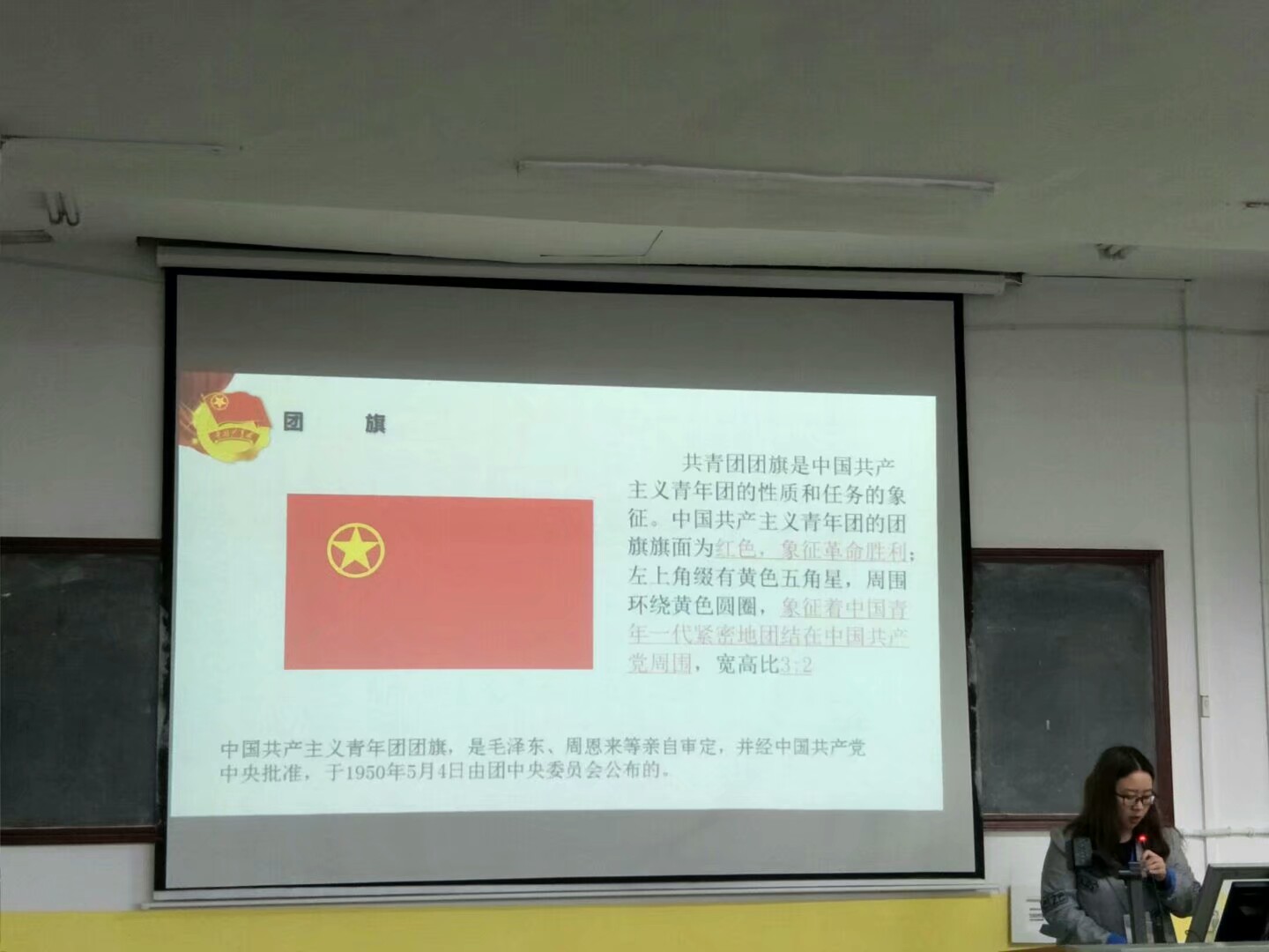 更重要的是团的特征,在此次课上,组织部副部长向大家展示了团徽、团旗和团员证。团徽的内容包括团旗,齿轮,初生的太阳及其光芒,写有“中国共产团”五字的绶带。团旗旗面为红色,象征革命胜利左上角缀有黄色五角星周围环绕黄色圆圈,象征中国青年一代紧密地团结在中国共产党周围。团员证为墨绿色象征青春和朝气蓬勃的青年运动,是中国共产主义青年团团籍的证明。
