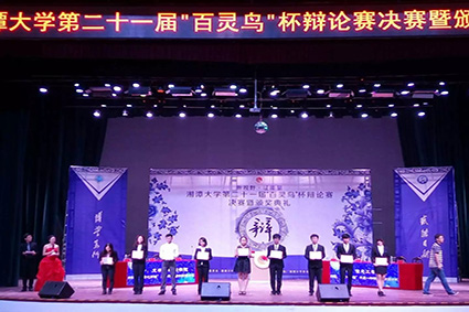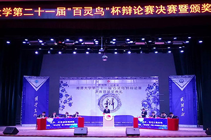 5月17日晚七点,湘潭大学第二十一届“百灵鸟”杯辩论赛决赛暨颁奖典礼在湘大俱乐部举行。本次活动的嘉宾有湘潭大学副校长刘建平教授、湘潭大学党委宣传部齐绍平部长、湘潭大学党委宣传部赵猛副部长、湘潭大学学生工作部谢罗奇处长、湘潭大学学生工作部胡阳副部长、湘潭大学教务处俞祖国处长、湘潭大学教务处王协舟副处长、湘潭大学招生与就业指导处宁国良处长、湘潭大学团委吴彬彬副书记。本次辩论赛评委团由5名专业评委组成,他们分别是党委办公室副主任谷立平、湘潭大学出版社副社长蒋海文、公共管理学院教授梁丽芝、法学院及知识产权学院教授曹艳芝、哲学系副教授周骅。主持人由郭禹彤和李丹担任。