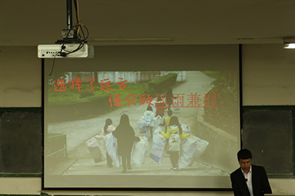 在志愿服务的视频中,志愿者们在敬老院为老人们表演节目的身影,我们能够感到老人们的眼中有着幸福的感动;几个女生结伴敲开一扇扇寝室的门回收废品,每一个人都拎着巨大的编织袋,有的人手中甚至提了四个,但她们的脚步仍然那么坚定;援建河口镇,志愿者用自己的经验为弟弟妹妹讲述着过来者的经验故事……