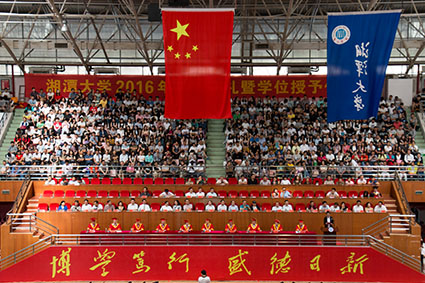 6月16日上午8:30,湘潭大学2016年毕业生典礼暨学位授予仪式在新体育馆准时举行,全体毕业生身着学士服,饱含着激情与不舍参加了他们在校的最后一次活动,完全属于他们的活动。出席本次毕业典礼的校领导有:校长黄云清、党委副书记周益春、校纪委书记高协平、副校长宁建民、副校长郑赤建、副校长刘建平、副校长刘长青、副校长廖永安、副校级督导员张海良、党委书记章兢,并由党委书记章兢主持了本次毕业典礼。学校的老师、毕业生的家人以及在场的工作人员和所有毕业生一起共同见证了这庄重喜悦、令毕业生们永生难忘的一幕。