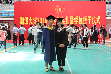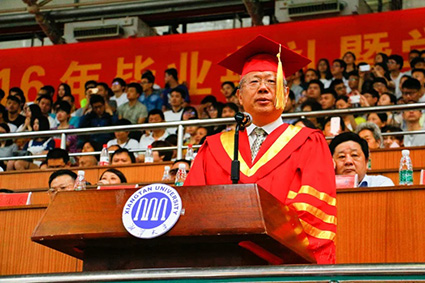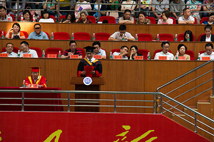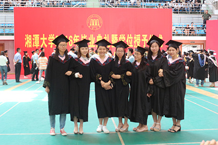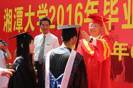 校长黄云清代表学校发表了毕业致辞,表达了对大家的祝福与希冀。他用轻松幽默的语言化解了离别的悲伤:羡慕好运的你们能够得天之眷,回味青春的你们让学校有了绚烂的色彩,不舍毕业的徒儿就此别去只留记忆在这里,毕业很快,我们都懂,大家别难过,“毕业季的味道,就是这么酸爽”。又以一个长辈的慈祥,细心嘱托在场即将远行的学子:梦想不论大小,母校永远为你们的青春梦想点赞;实现梦想不易,希望你们能“不忘初心,不畏将来,不放弃,不懈怠”;步入社会,你们依旧要不断学习,在当今的“互联网+”时代,“活到老学到老”才是王道;“博学笃行,盛德日新”,不要忘记湘大的校训,继续博学,继续笃行!以后,历练不小,困难也不会小,但“湘大人的骨子里最不缺的就是自信,湘大人无论走到哪里,就如同洞庭湖的杨柳,倒着插也能长”;虽有自信,但自信也要审时度势、量力而行,学会知进退、懂取舍。校长黄云清最后的一段话让不少人潸然泪下:入三拱门为“湘大学子”,出三拱门为“湘大校友”,今后对你们的称呼也该由“同学们”改为“女士们先生们”了,但无论称呼如何变,我们都是湘大人,那青春的故乡叫做湘大!话音未落,全场掌声雷动、经久不息,场下传来大家的阵阵欢呼声。