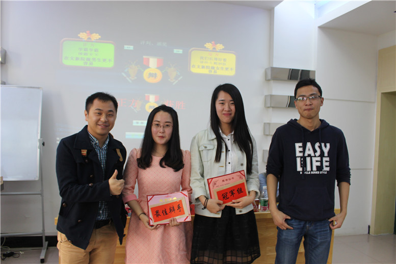 男生们的“心酸史”。他们逻辑清晰的辩词,时时博得同学们的阵阵掌声。在三人轮番的陈述过后,由一直以来见证全程比赛的三位议长投票选出。最后,胡银萍以两张票数摘得“奇葩新说”最佳辩手。