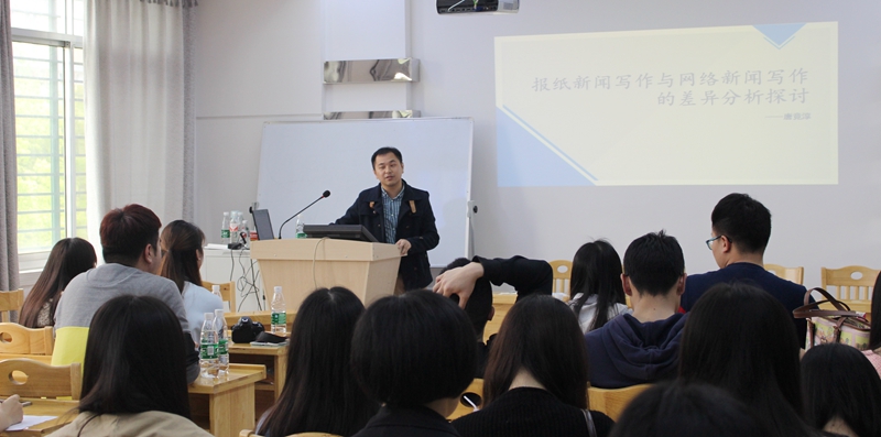 4月23日晚,湖南广播电视台旅游频道活动产业部主任、大公报湖南分社首席记者唐竟淳应我院邀请,在文科楼318会议室为我院学生作了题为“报纸新闻写作与网络新闻写作的差异分析”的精彩学术讲座。讲座由研究生会主席杨文博主持。