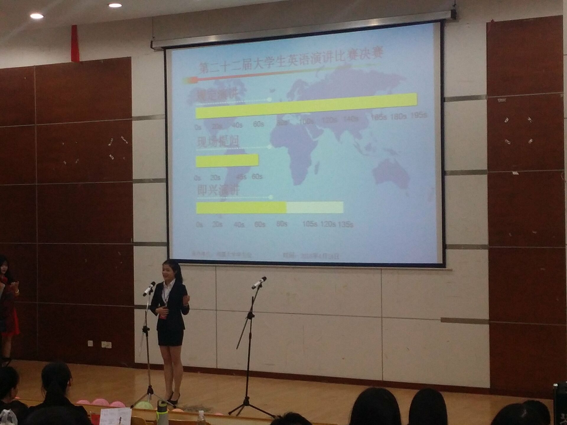 4月24日下午2:30,湘潭大学第22届大学生英语演讲比赛决赛在逸夫楼第二报告厅准时开赛。此次比赛的评委老师有:胡慧老师、唐洪波老师、金益云老师、范正君老师、祝四清老师、尹雪梅老师、杨柳老师。此次比赛历时三个半小时,紧张激烈,各位选手通过他们流利的口语能力,极强的英语水平给观众们带来了一场精彩的英语视听盛宴。