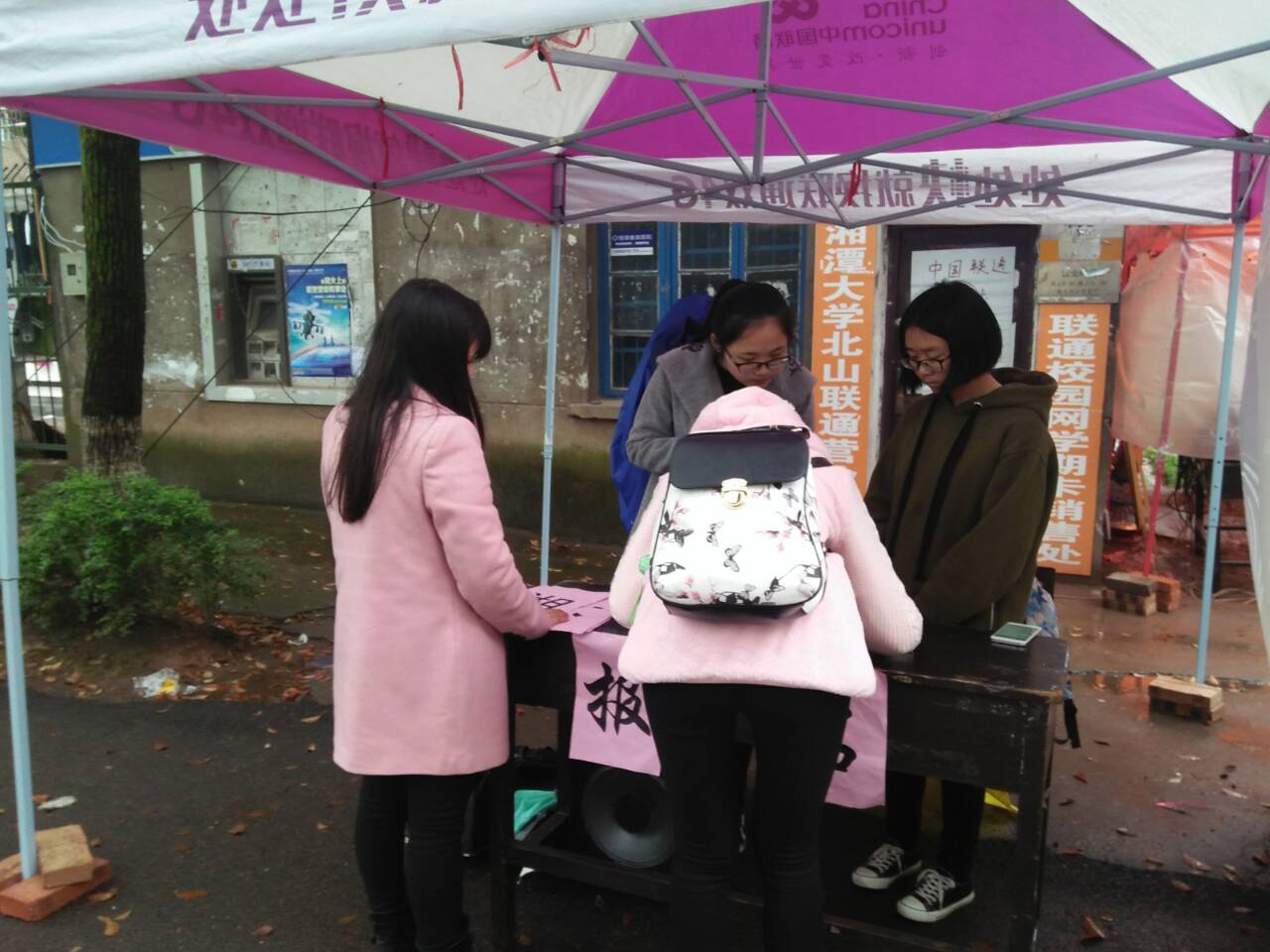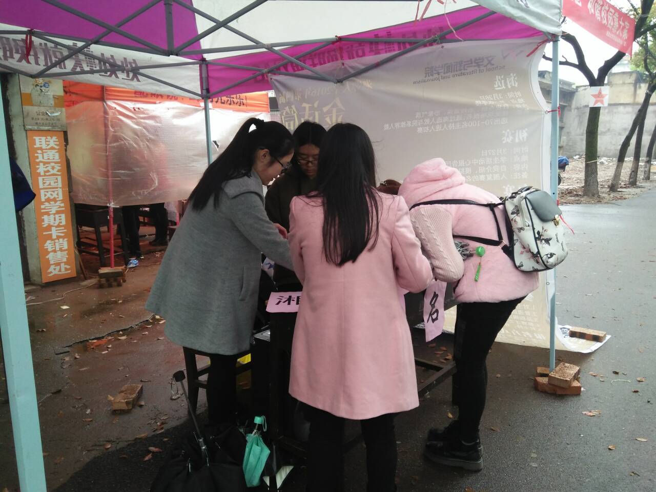 三月清晨的湘大,气温依旧很低,春雨濛濛,冷风瑟瑟,但摆点的同学们很早就来到摆点处,抬好桌子,支起帐篷。早上的风很大,雨水打湿了帐篷、桌子,也打湿了同学们的衣服,但他们仍热情不减,挂好喷绘,整理好报名表,在寒风中坚持着。干事们,部长们甚至主席团成员全都投入了摆点工作中。