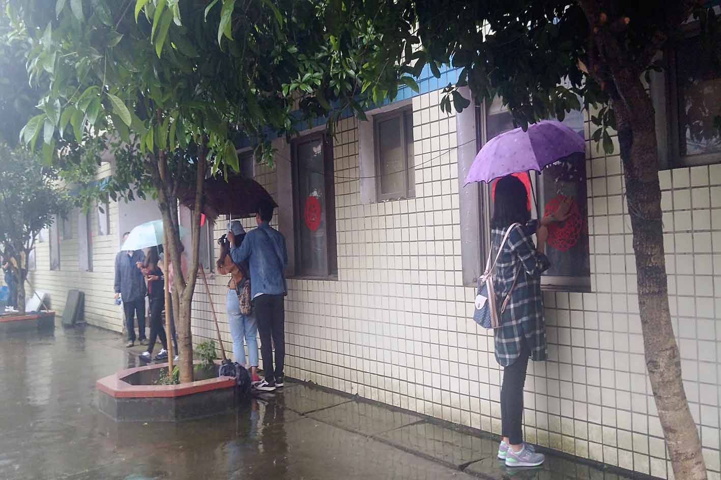 志愿者们首先为敬老院换上了新的花窗,他们在雨中两两搭档,红红火火的窗花为原本有些冷清的敬老院增添了几分喜悦吉祥。