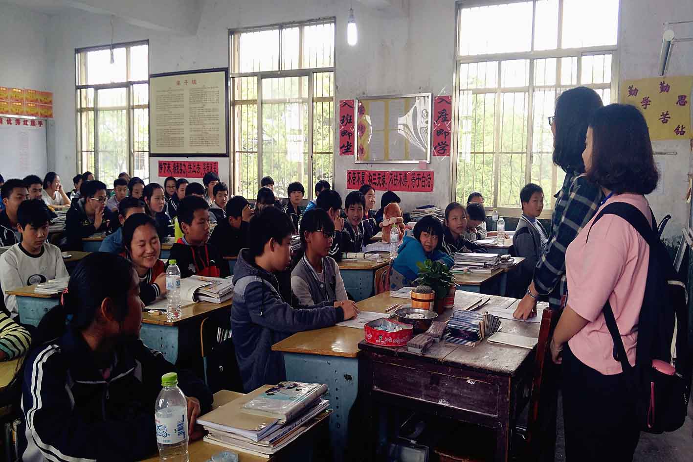 一到河口镇中学,罗老师就热情接待大家,给同学们送上水和糖果。而后,志愿者们分别在九年级154和153班进行了以“中考加油”为主题的演讲。志愿者们结合自身经历,真实表达内心感受,对即将中考的孩子们的困惑进行详细解答。其中在154班进行演讲的志愿者陆敏还拿起同学们的英语试卷按题型顺序逐一解答。幽默欢快的课堂气氛,让孩子们时不时绽开笑脸。志愿者们还给每个孩子送上小礼物——带有志愿者们亲手写下的针对每个孩子问题的小本子。礼轻情意重,字字饱含志愿者们真挚的祝福和鼓励。