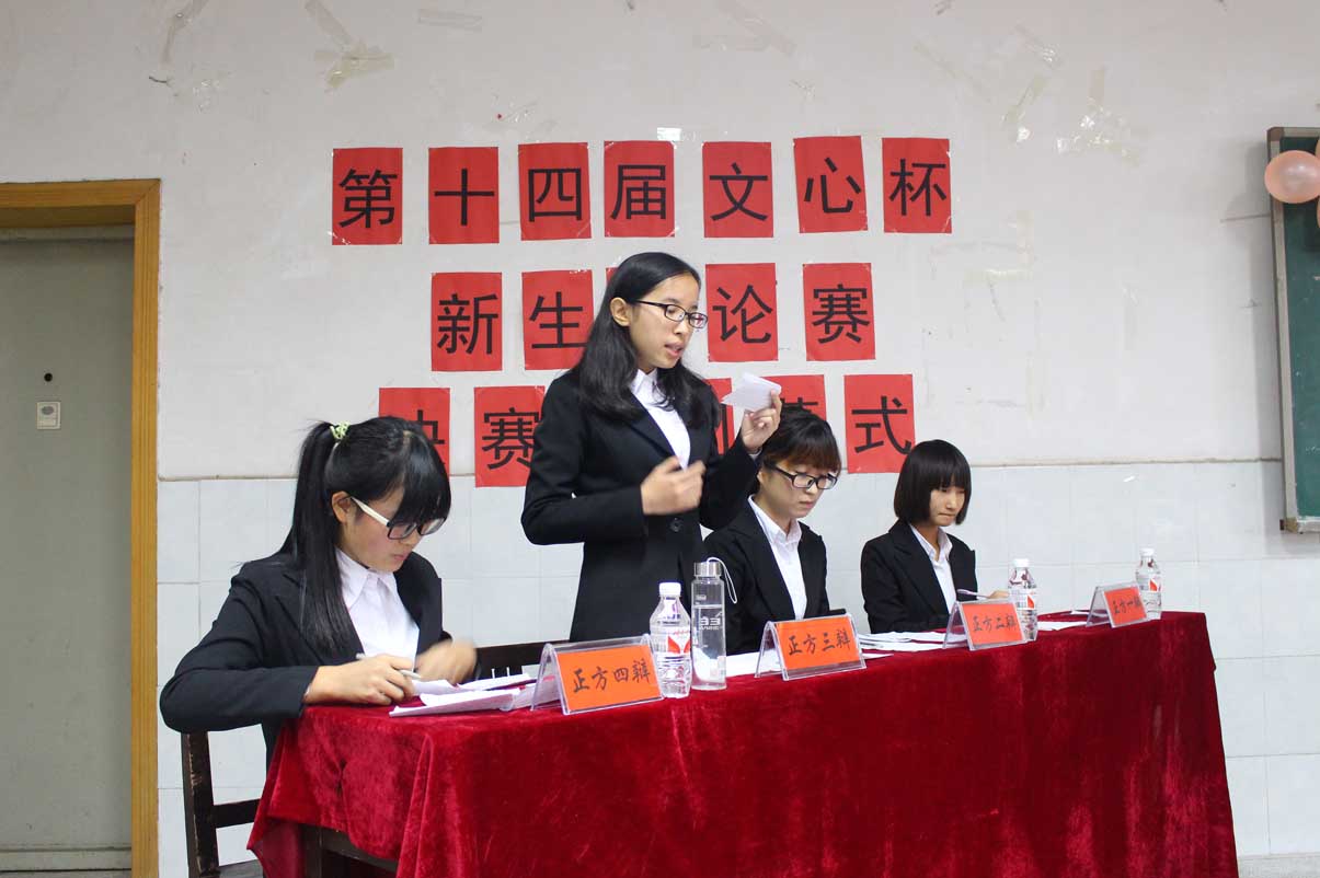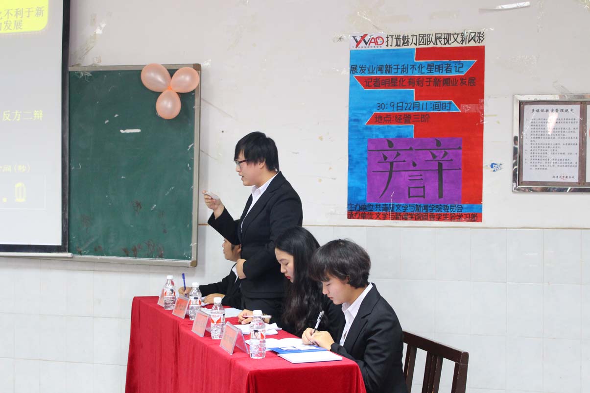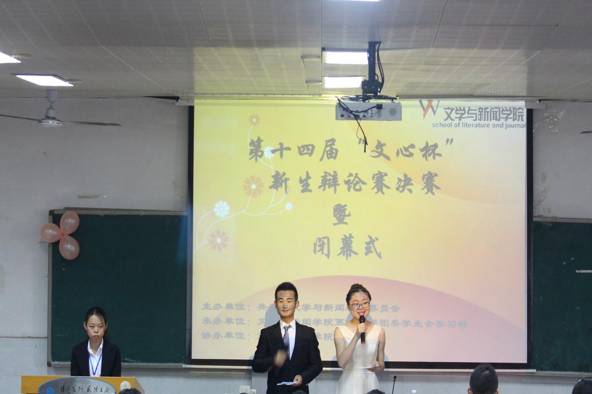 11月22日上午九点半,第十四届“文新杯”新生辩论赛决赛暨闭幕式在经管三阶举行,15新闻一班和15广电一班展开对决。我院团委学生会主席团成员及各部部长作为嘉宾出席。担任本场比赛评委是的机械院辩论队队长王秦威学长,历史院辩论队队长王冬梅学姐,商学院优秀辩手汪佳艺学姐,公共管理学院辩论队队长李钰学姐,化学院辩论队队长李昔悦学姐,信工院辩论队队长陈杨学姐,旅管院辩论队队长刘思奇学长。韩宸旭、张昉担任本场比赛主持人。