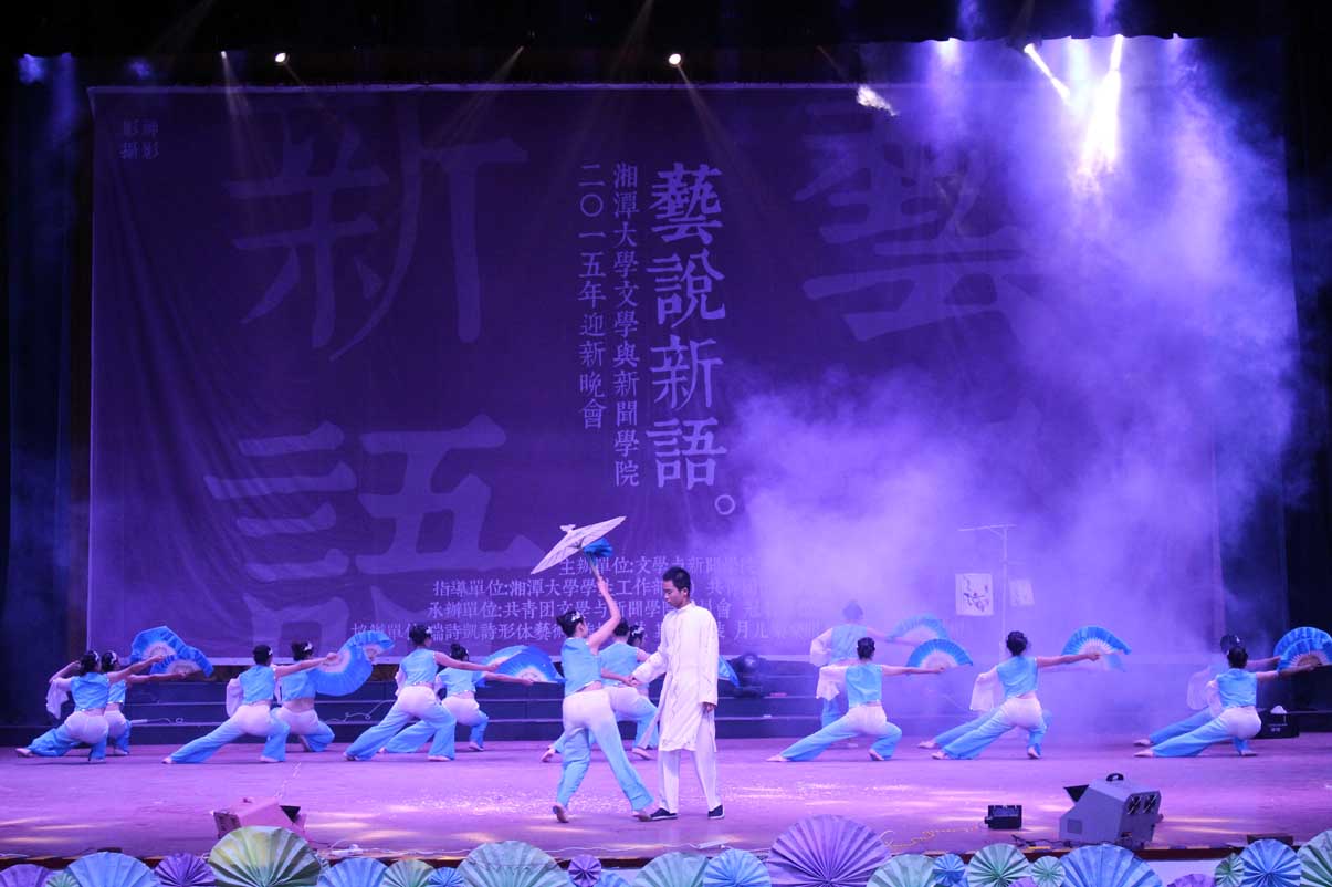 晚会在观众的倒数声与往年迎新晚会的视频回顾中开始。开场舞《聆风谣》,轻柔且大气的舞姿配以细腻且磅礴的音乐,梦幻的灯光配以迷离的烟雾,纤纤玉手中的折扇轻妙流转,一份古韵仿佛使人陷入一份古香古色的回忆当中;15广告2班的《Good Boy》则极富现代感,闪烁的灯光和动感的旋律为街舞表演的动感帅气增色不少;《奇趣逸舞》是由15广告1班,15中文1班和15中文3班共同带来的大型创意舞蹈串烧:由手影演绎的“梁祝”的凄美爱情、浪漫和谐的华尔兹,以及以欢快的童谣与杯子舞作背景音乐,身着黑白交替舞服的舞者带来的儿童游戏化舞蹈,为我们带来一幕幕视觉盛宴,表演结束后,台下掌声雷动。