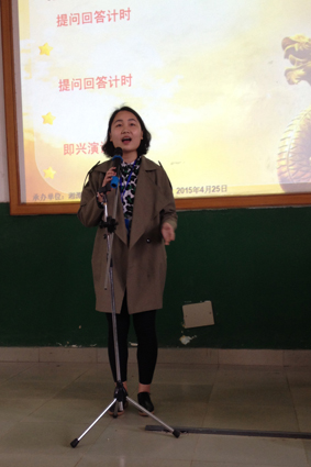 而另一位我院参赛代表王丹作为第三赛场的18号选手出场。她神态自若,娓娓道来。首先他以一位学长因惧怕就业压力而选择考研的事例引出了大学是一座象牙塔的话题。接着,她叙述了自己对于这一说法的质疑与最终肯定,她认为我们都是在梦想着象牙塔之外的生活,但是却在未来来临时选择逃避。她说我们应该勇于尝试和改变,打破象牙塔之窗。最后,她以自己暑假志愿支教的经历,进一步论述了努力改变和挑战自己的重要性,号召大家不要呆在自己想象中的象牙塔和方寸安全之地。在提问环节,她一直提到“Do better”,她希望通过不断尝试改变做得更好。在即兴演讲环节,她围绕“The hero in my eyes”叙述了自己心目中的英雄哈利波特。整个演讲她神情淡然,语调轻柔而富有情感。