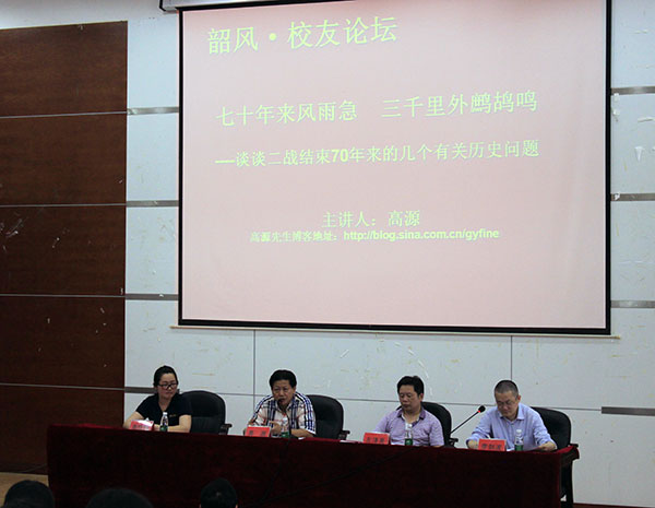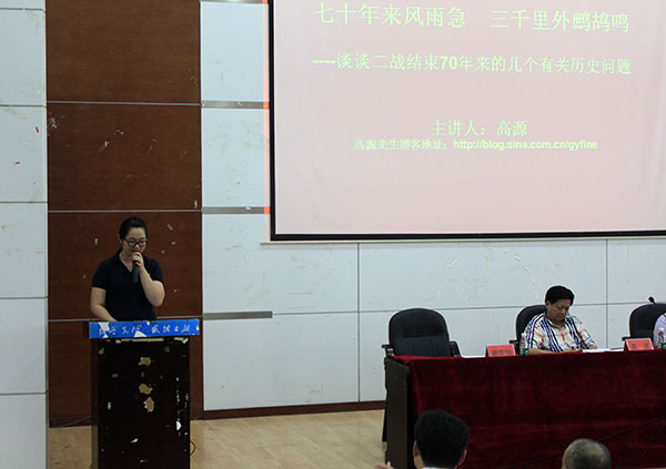 接着,高源先生开始了以“七十年来风雨急 三千里外鹧鸪鸣——谈谈二战结束70年来的几个有关历史问题”为题的讲座。他从俄、美、中、日纪念二战的方式谈起,引出了联合国、世界贸易组织的成立这两个二战的重要成果。接着,高先生就殖民体系瓦解、冷战与意识形态对峙,以及美苏争霸的重要历史事件:封锁柏林危机、朝鲜战争、苏伊士运河冲突、柏林墙、古巴导弹危机、越南战争、苏联侵略阿富汗等等,为我们深刻解析了冷战时期的世界大局,并就与二战历史有密切关系的蒙古问题、台湾问题、中日关系问题与同学们一一进行了探讨,让学生们大开眼界。