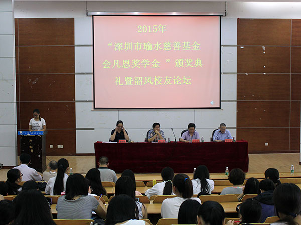 2015年5月30日下午三点,2015年“深圳市瑜水慈善基金会凡恩奖学金”颁奖典礼暨韶风校友论坛在我校逸夫楼第二报告厅举行,这是高源先生第九次颁发“凡恩奖学金”,并从此次开始纳入深圳市瑜水慈善基金会的统一管理,瑜水基金是深圳市湘潭商会部分企业家创立的非公募慈善平台,在深圳市民政局注册。