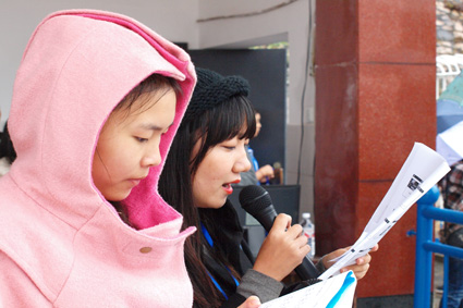 学生一直认真整理各院来稿,并热情满满地念出,表达对运动健儿们最真挚地祝愿。因为是雨天,她们还给了运动员们温馨提示,希望运动员们把雨中比赛当做另一种挑战与乐趣,赛前充分准备,赛中注意安全。李慧与张弘靖的讲说一直飘荡在第二田径场,为运动会增色不少。