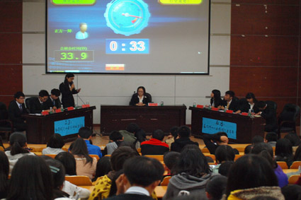 此次表演赛的主席是黄立意,正方辩手分别是:一辩舒爽爽,二辩冯赵越,三辩高峰,四辩邓泽湘,反方辩手分别是:一辩李莹莹,二辩周哲聪,三辩吴双,四辩彭谦。此次辩论的辩题是:与谁同行和去往何地哪个更重要?正方的观点是:与谁同行比去向何地更重要,反方的观点是:去向何方比与谁同行更重要。