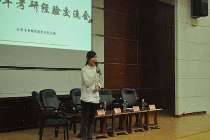 交流会伊始,唐春副书记发表了讲话。唐春副书记首先对辛苦筹备交流会的党支部和愿意分享经验而来的四位同学表示了感谢。接着,介绍了今年10级的考研情况。我院今年考研成功(包括保研)的人数大约占我院10级总人数的16.3%,创7年来最高。另外,唐春副书记详细的介绍了保研方面的一些事项。学校近年的保研政策有微调,大学前三年成绩的专业排名在前30%的都有资格报名;前三年的排名会折算成一定分数占保研分数的80%,另外的20%则参考面试和外语口语考试的成绩。而指标同样会按相近的比例分配到各个专业。此外,我院今年成功争取到了新闻传播学的专业硕士学位点,成为一个新的变化。