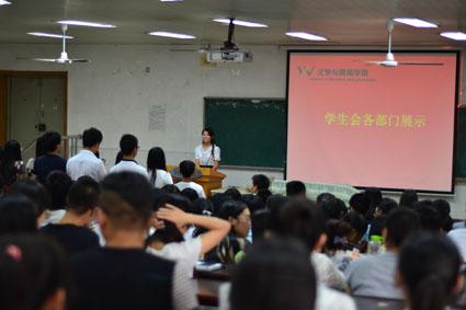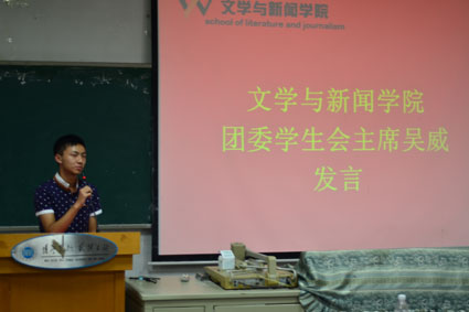 接着,团委学生会主席吴威也上台发言。他首先对大家的加入表示了欢迎,并希望新一届干事们可以珍惜未来的时光,由相遇到相知相熟,也希望大家静下心来,安静工作,快乐生活,爱上这里并且不愿离开。接着,学生会宣传部部长杨锦涛作为部长代表发言,他再次强调了学生会存在的意义在于为同学服务。杨锦涛也表示愿意做干事们工作上的引路人,生活中的朋友,也希望他们在学生会的大家庭里学会一些服务意识,提升一点专业素养,发展一些个人兴趣,付出并收获一份真情。之后,组织部的干事作为代表发言,再次阐述了为足球赛事直播