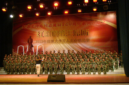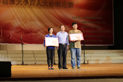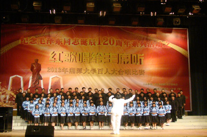 2013年10月10日晚7点30分,纪念毛泽东同志诞辰120周年系列活动之“红歌唱给主席听”2013湘潭大学百人合唱比赛在我校俱乐部隆重举行。经过两个小时的激烈比拼,我院凭借一首气势磅礴的《太行山上》,以9.70的高分获得一等奖。