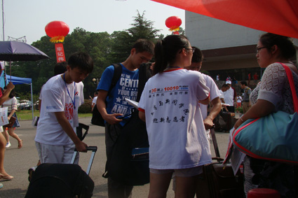 早上六点,志愿者们就开始了一天的忙碌,尤其是帮忙搬运新生行李的男生们,他们往来于新生寝室和迎新点之间,一次次地帮新生们搬运厚重的行李,汗水将他们的衣服一次又一次浸湿,早已疲惫的身体却依旧不肯停歇,当让他们休息一下时,他们总是说不用了,继而转身去接起下一个新生的行李,在这条迎新之路上洒下更多的汗水。尽管天气闷热,他们却十分积极,因为去年的这个时候也有学长帮他们搬运行李却不叫苦不叫累依然满面笑容,而今年他们也想让新生感受到这种温暖与热情,尽自己的一份力将温情传递。