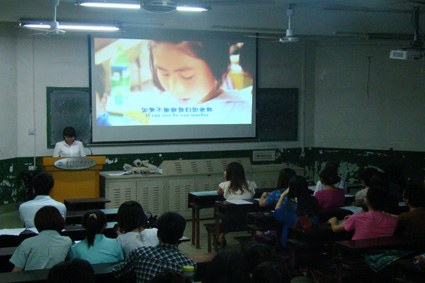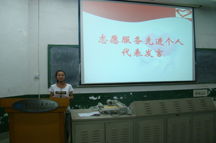 之后,志愿服务先进个人代表刘荣浣上台发言。她首先感谢了青志部对她志愿工作的肯定,紧接着,她就一年志愿生活进行感言,她表示,印象最深刻的就是“朝阳红”义务支教活动,一年中,她在支教活动中收获了很多,那些天真无邪的孩子们给她留下了极其深刻的印象。她们带给孩子们以无私,孩子们回报她们以欢笑。志愿活动永不停息。更多的志愿者们通过视频表达自己志愿服务的感受,抒发对青志部未来发展的寄语。
