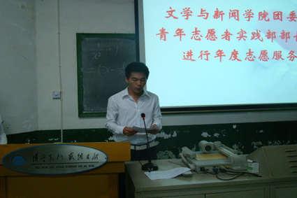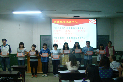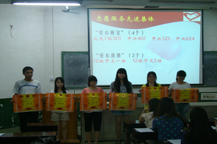 6月7日晚7点30分,由我院团委学生会青年志愿者实践部承办的2012-2013年度志愿服务表彰大会在北山第一阶梯教室成功举行。到场的领导有:我院党委唐春副书记和团委管胜昔老师。整堂表彰大会在回顾中总结,在表彰中进步,展现了文新学子始终践行着的志愿服务精神,感染着在座的每一个人。
