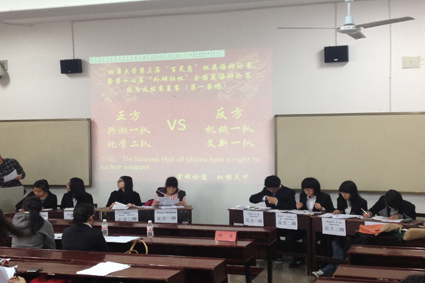 第一赛场,在正、反方一辩首先陈述己方观点后,双方展开激烈辩驳。当双方三辩分别以实例进行分析时,第一赛场的高潮也随之出现。我院二队选手以一口流利的英语从“承认拥有核武器的权力就等于允许世界各国都研发核武器”的漏洞向正方提出了质询,条理清晰,一针见血,使得对方难以应变,最终将比赛开局的优势保存到了最后。