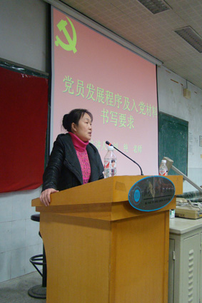 本次培训班授课主题是:《党员发展程序及入党材料书写要求》。刘纯老师首先为大家介绍了党员发展程序,她从“如何确定入党积极分子”、“对入党积极分子的培养与教育”、“预备党员的接收”、“预备党员的管理、教育、考察和转正”等方面详细阐述了一个高素质的共产党员产生的过程。在此刘纯老师强调了入党的重要性,也详细地给大家说明了作为一个党员应满足的条件和要求。同时她也表示,希望大家严肃地对待入党这件事,更要努力创造条件争取入党。