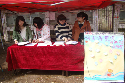 团委学生会青年志愿者实践部在北苑主干道摆点招募“保护湘江母亲河——湘江之行”活动的志愿者。