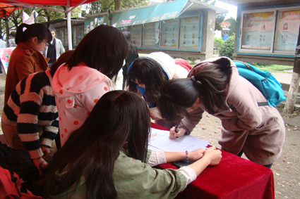 青志部的干事们就搭建起了临时招募点。7时,就开始有同学陆陆续续地前来报名参加。中午下课后,志愿者招募点顿时人声鼎沸,许多同学在招募名单上写下了自己的名字,并在旁边的海报上贴上了自己的祝福语。在志愿者招募现场,接受采访的徐同学说道:“保护湘江母亲河活动,既体现出了当代大学生素质的全面发展,也体现了我们对整个社会的关心。这不仅仅是一次简单的环保活动,也是一次能够培养大学生社会责任感的活动。”