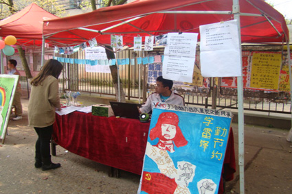 团委学生会权益保障部承办的“学雷锋、勤节约”活动在北苑进行摆点宣传。本次活动以“学习雷锋精神,贯彻十八大思想”为主题,旨在向同学们介绍关于节约环保的相关知识,并且呼吁广大同学们行动起来,积极参与。